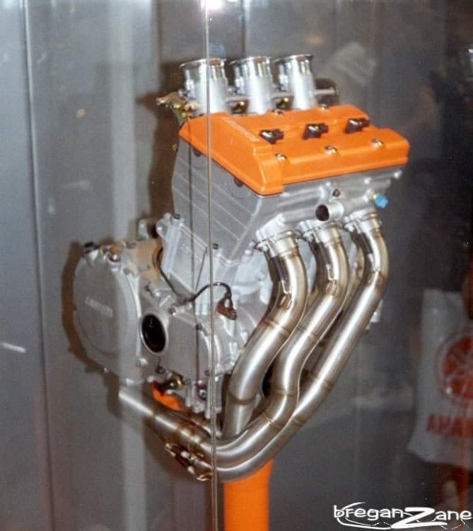 Herr Lolli zeigte mir auch einen Motor, der in einem Fahrwerk mit 17-Zoll-Rädern und Upside down montiert war. Dieser Motor war ein 3-Zylinder mit Wasserkühlung, Tassenstössel, Einspritzanlage, Antrieb links und einer 3in1 Auspuffanlage. Es herrschte absolutes Fotografier-Verbot!
